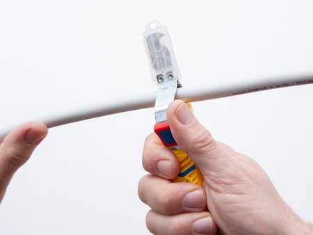 All you have to do is insert the inner conductor into the pliers and press them. The insulation is automatically stripped by the blade mechanism.