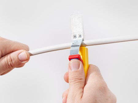 The handle of the modern version of this tool is so designed in such a way that the user has the most secure grip possible, which enables clean cable routing. The pressure bracket on the top of the cable knife pulls the cable securely to the inner knife and, together with the handle, ensures that the cable knife is guided precisely.